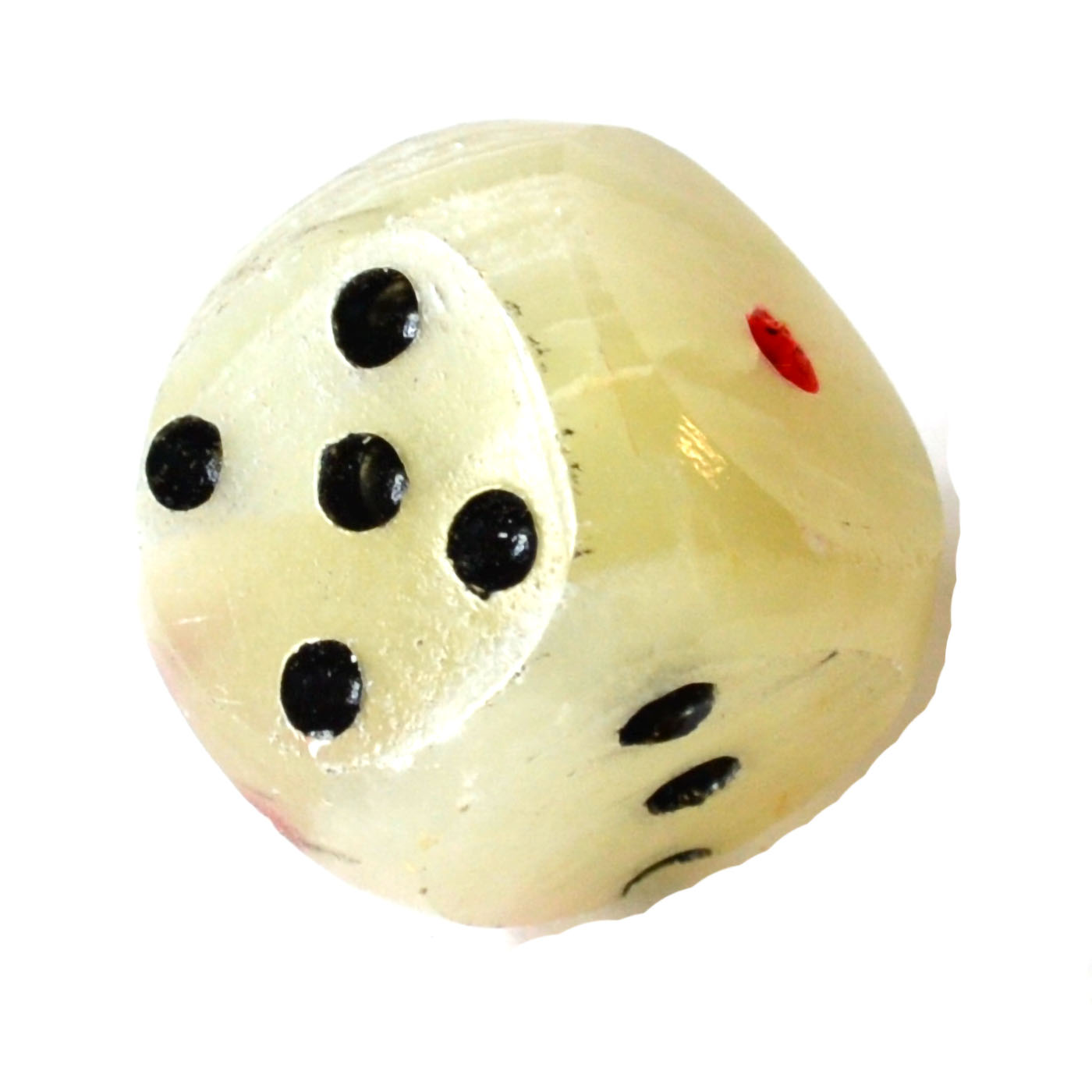 A 1" green onyx die, carved from natural stone and polished to a smooth finish. Featuring rich green tones with unique banding, each piece has its own distinct character.
