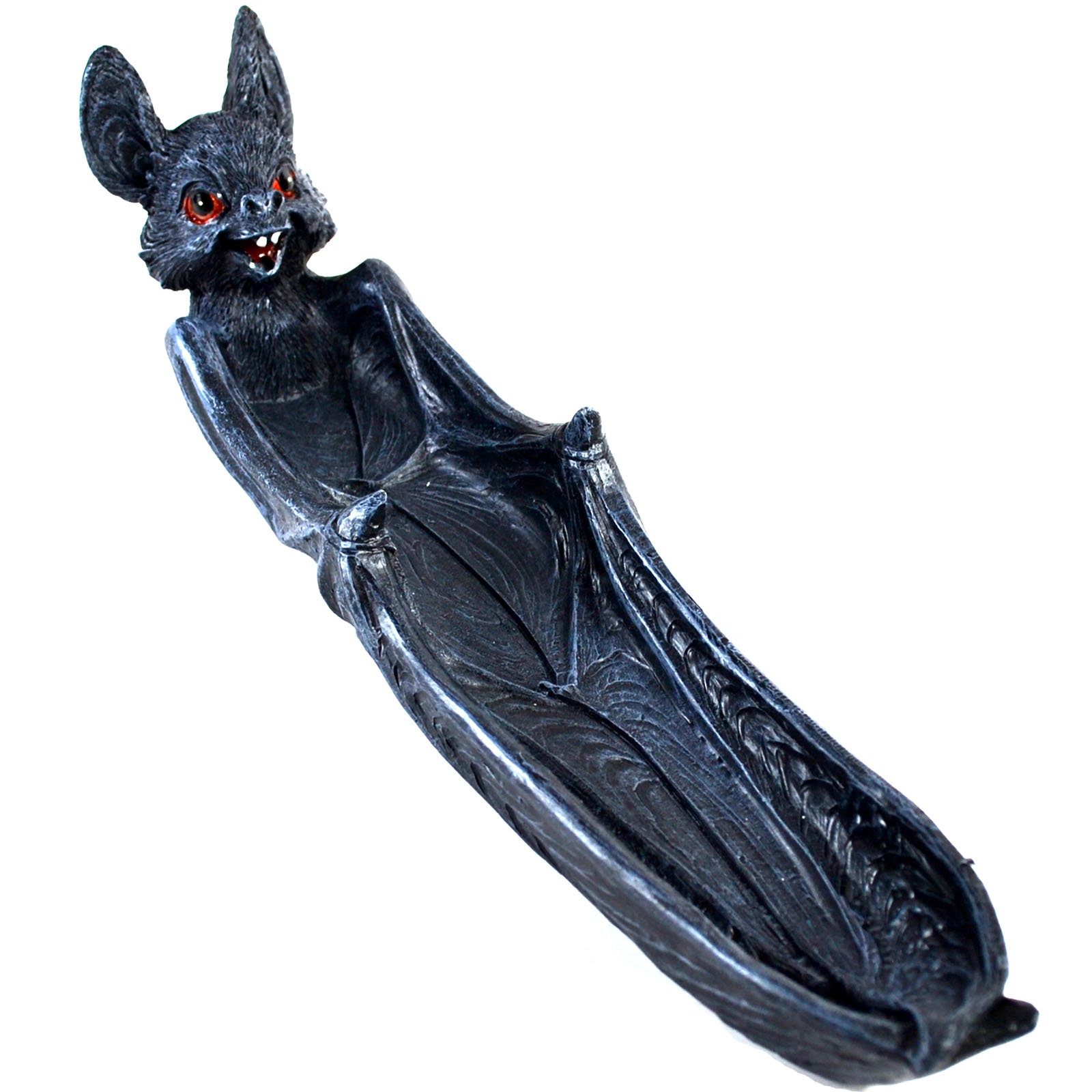 A reclined bat holds your favorite incense stick in its mouth while its wings catch the falling ashes. This fun piece offers great details in the carving of this cold cast resin ash catcher.