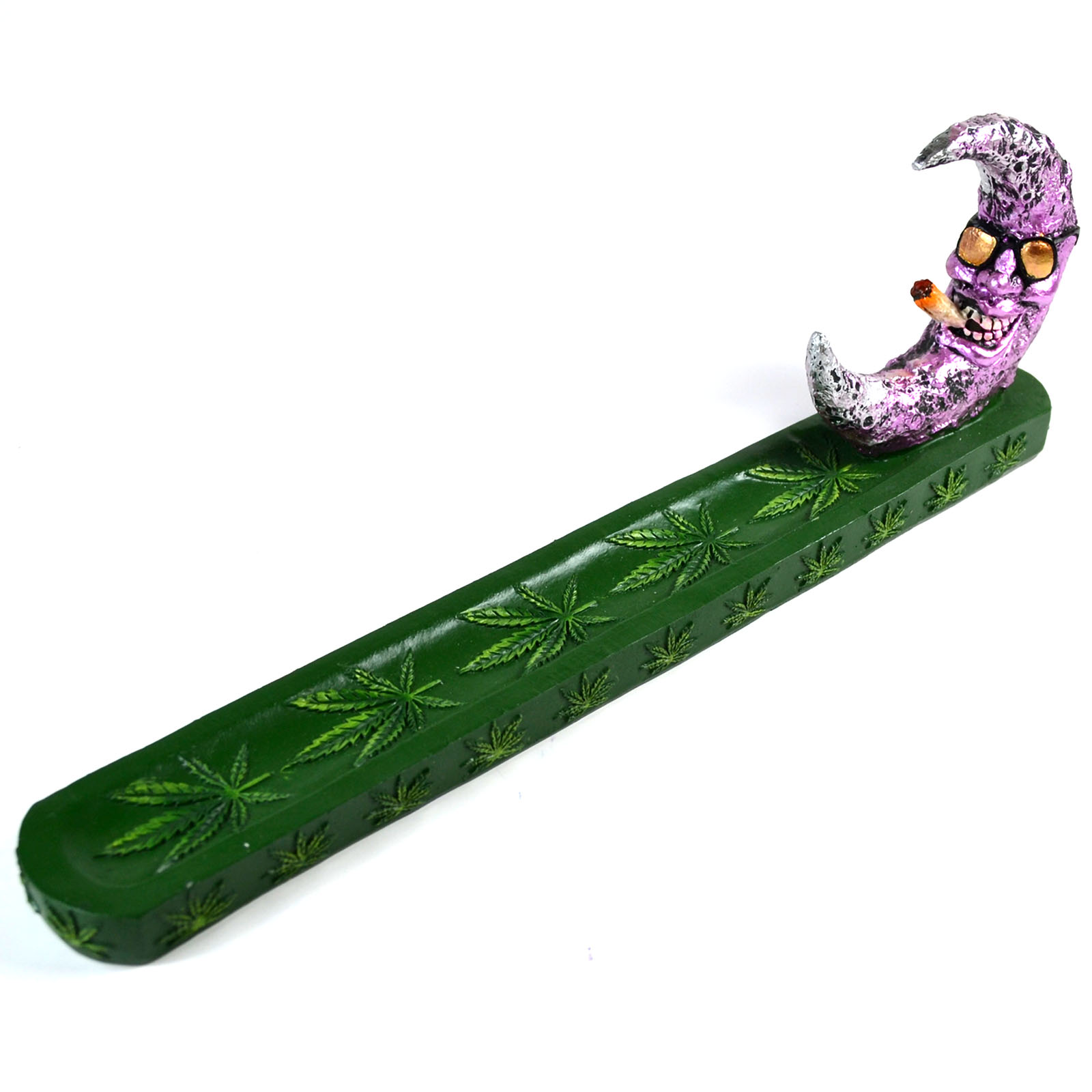 A metallic crescent moon kicks back and takes a slow, smoky puff on this playful stick incense burner. A blend of lunar charm with a touch of whimsy.