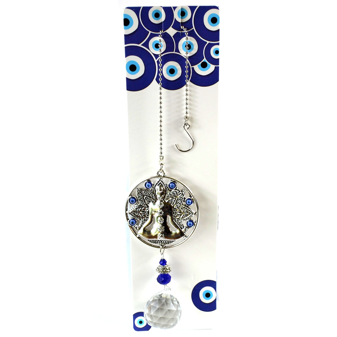 A serene Buddha suncatcher, paired with the protective gaze of the evil eye. Measuring approximately 13", this piece is finished with a large faceted ball to catch the light and scatter shimmering reflections throughout your space.