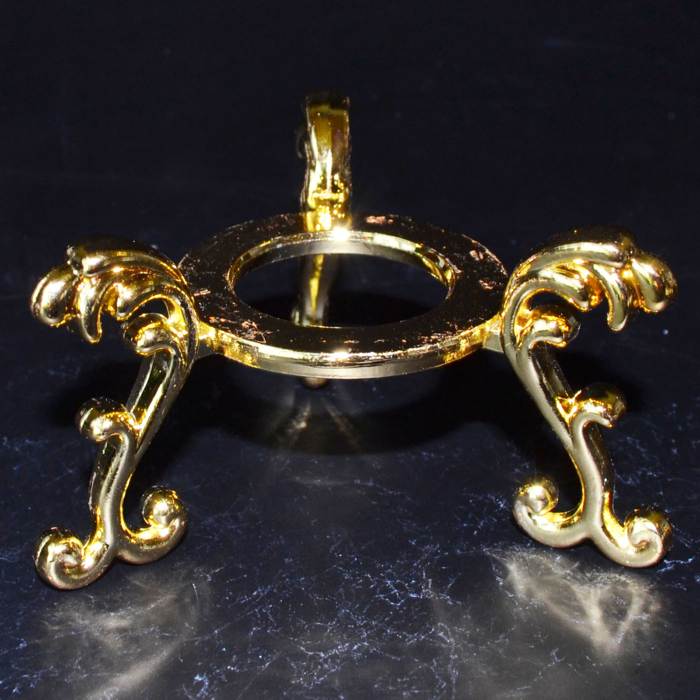 Stylish gold toned gazing ball stand with flared legs. 2 1/2" wide and comfortably supports an 80mm gazing ball