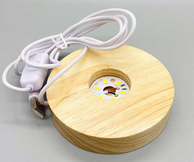 A wooden base with an led light to illuminate and reflect your transparent item placed on top. This is a white light to reflect the natural colors within your chosen display piece. Approximately 2.25" wide with a USB cord.
