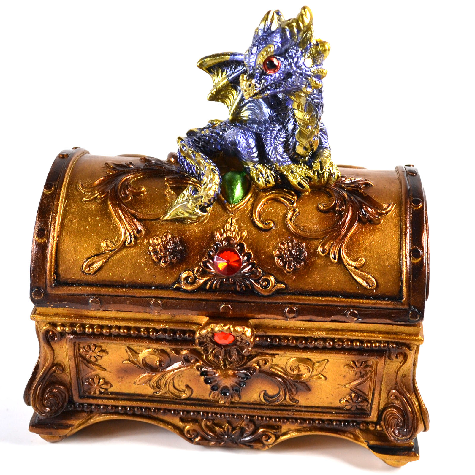 A dragon perches atop this treasure chest, guarding your small keepsakes. This whimsical piece is crafted with great detail.