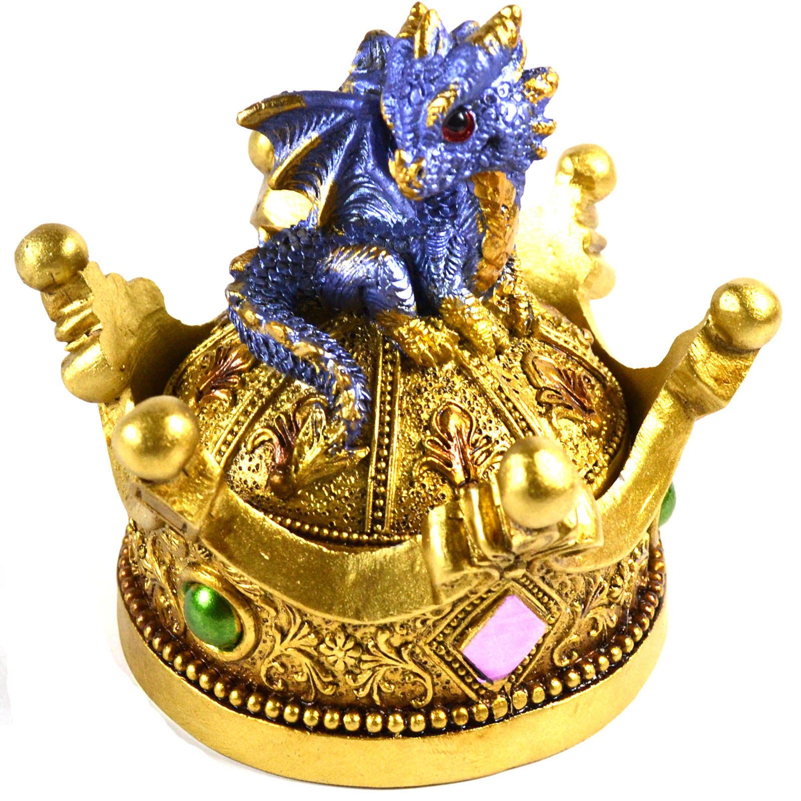 A metallic gold crown box, adorned with intricate detailing, crowned by a baby blue winged dragon perched regally on top. Let this whimsical design store all your treasured trinkets