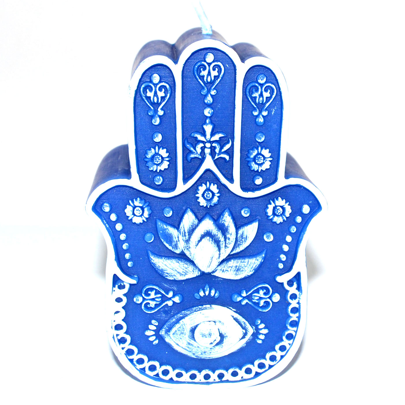 This calming blue toned Hand of Fatima candle, also known as the Hamsa, is a powerful symbol of protection and good fortune. Perfect for creating a peaceful atmosphere while inviting positive energy and warding off negativity. 2.65" x 3.9" Approximately a 20-40 hour burn time