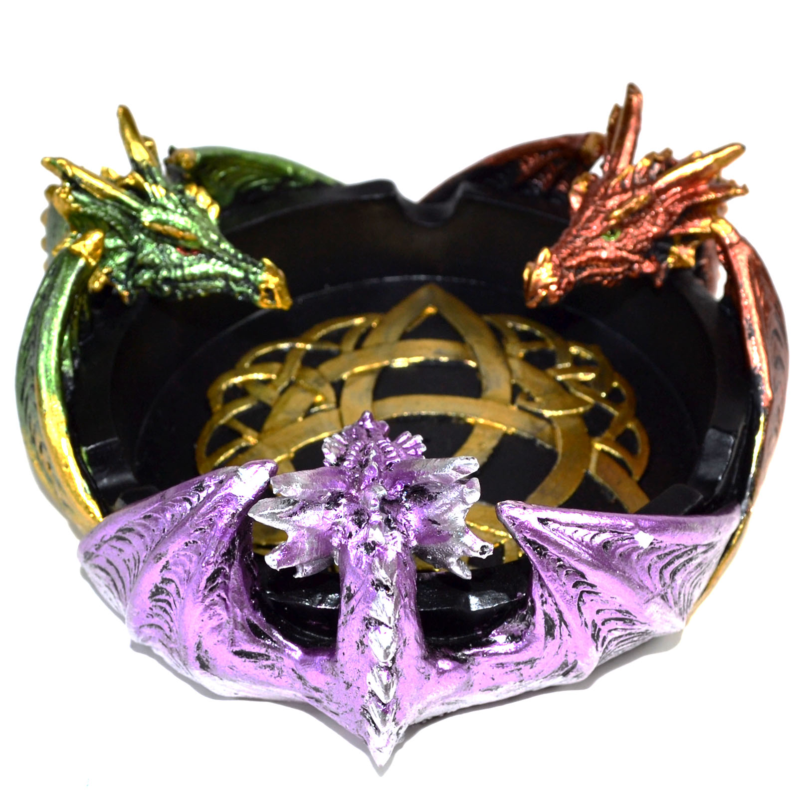 A trio of metallic dragons join wings to make up this ashtray. Created using cold cast resin with attention to detail.