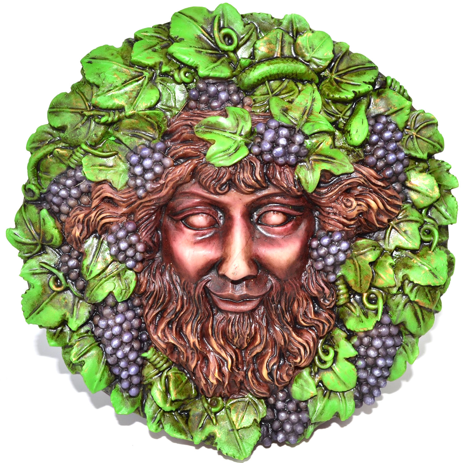 This plaque of Bacchus, the Roman god of wine and ecstasy, whom the Greeks knew as Dionysus. Cast in durable Polystone and hand painted from an original sculpture by the internationally recognized artist Oberon Zell.