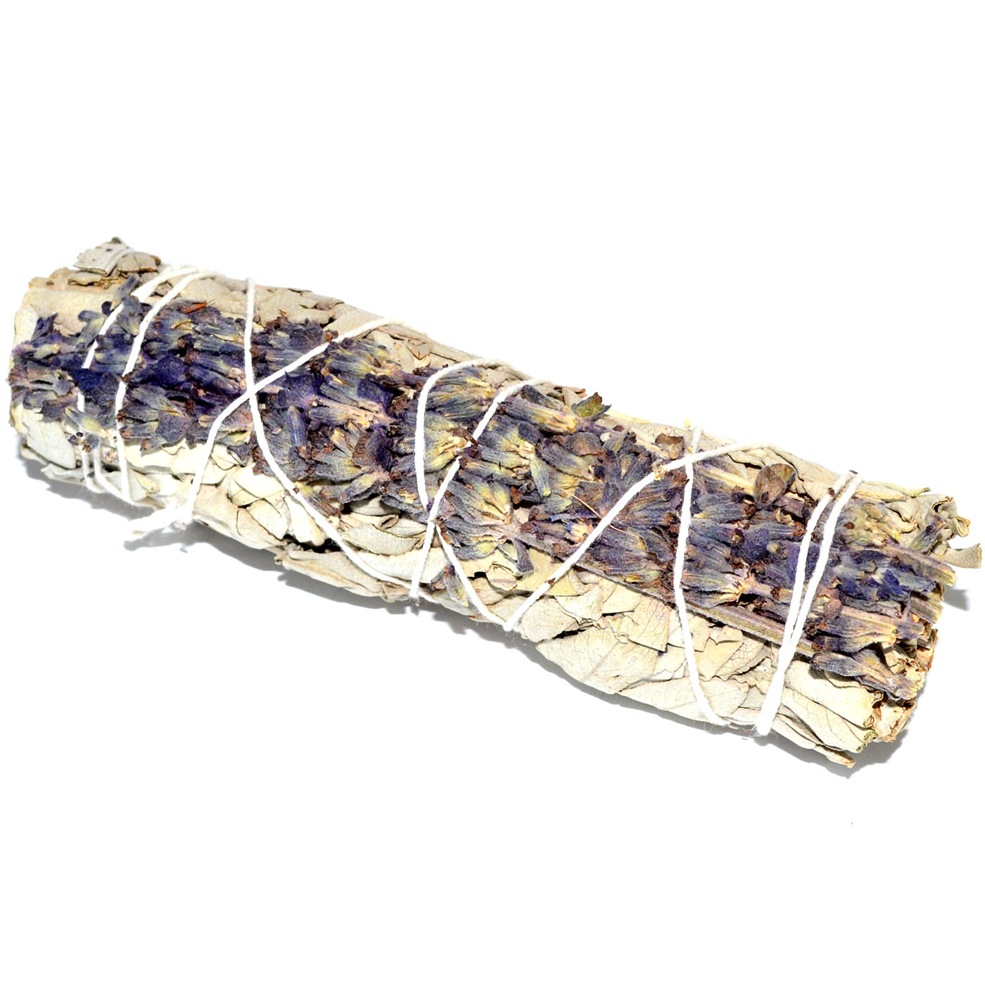 White sage and lavender smudge stick combining the cleansing power of sage with the soft, floral calm of lavender. 5"