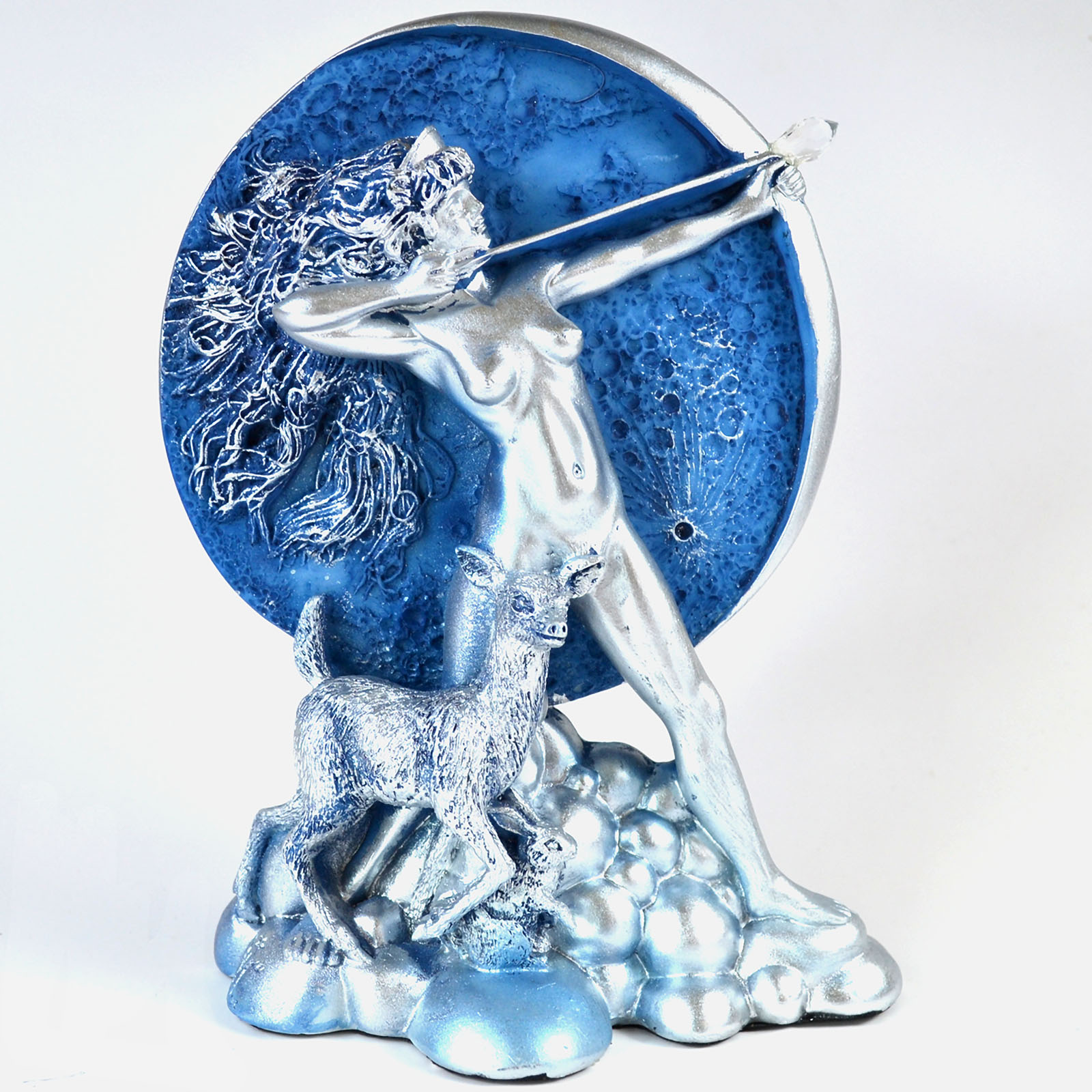 Silver and blue-toned cold-cast resin statue of Diana, the Moon Goddess, depicted drawing her bow with her animals at her feet and a striking blue moon rising behind her. Perfect for altar display or mystical décor.