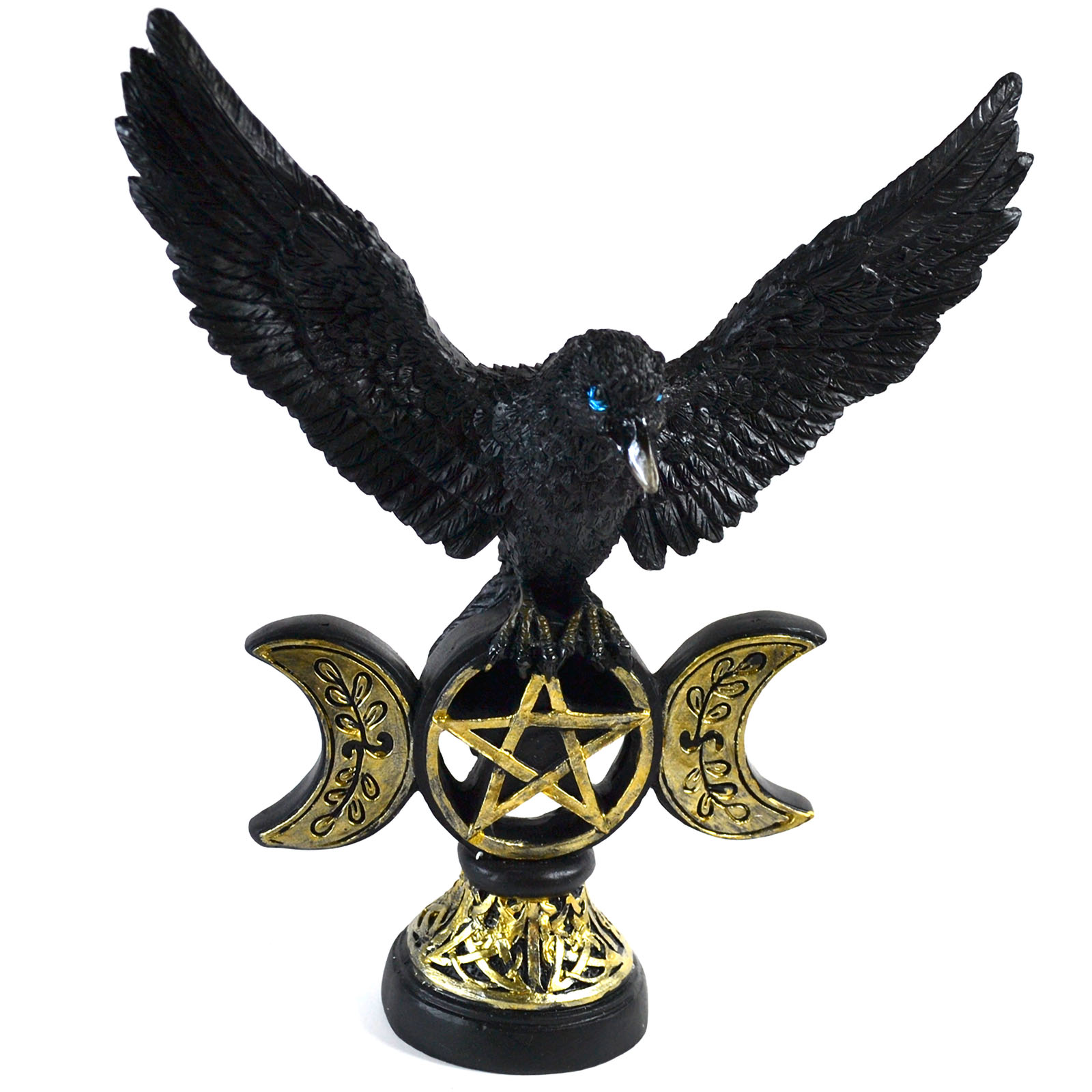 This crow pauses mid-flight, perching atop the pentagram of this triple moon design. Created with great detail and molded from cold-cast resin.