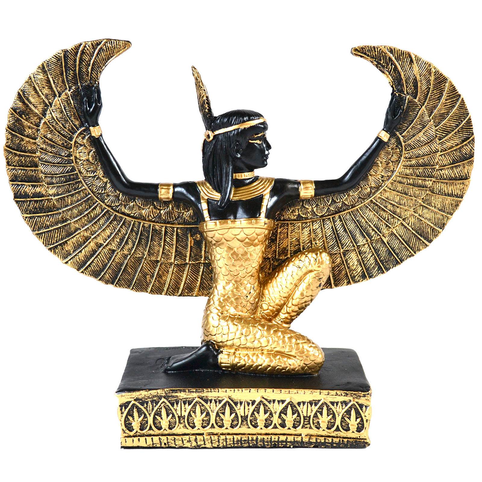 Cold-cast resin statue of Maat, the Egyptian goddess of truth, balance, and cosmic order, depicted with her wings fully open, a striking piece for altar display. 8 1/2" wide