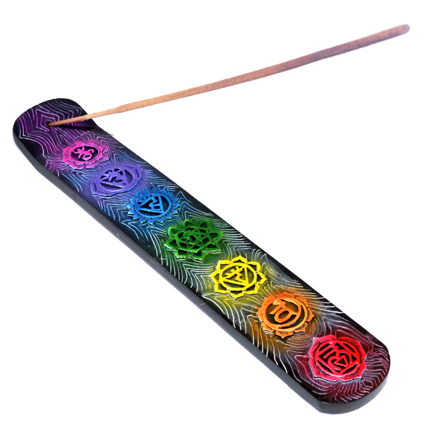 A vibrant resin incense holder featuring the seven chakra symbols aligned in a flowing design. Measuring 1.65" x 9.5", this stick incense burner is perfectly sized to catch ash while adding a colorful, spiritual touch to your space.