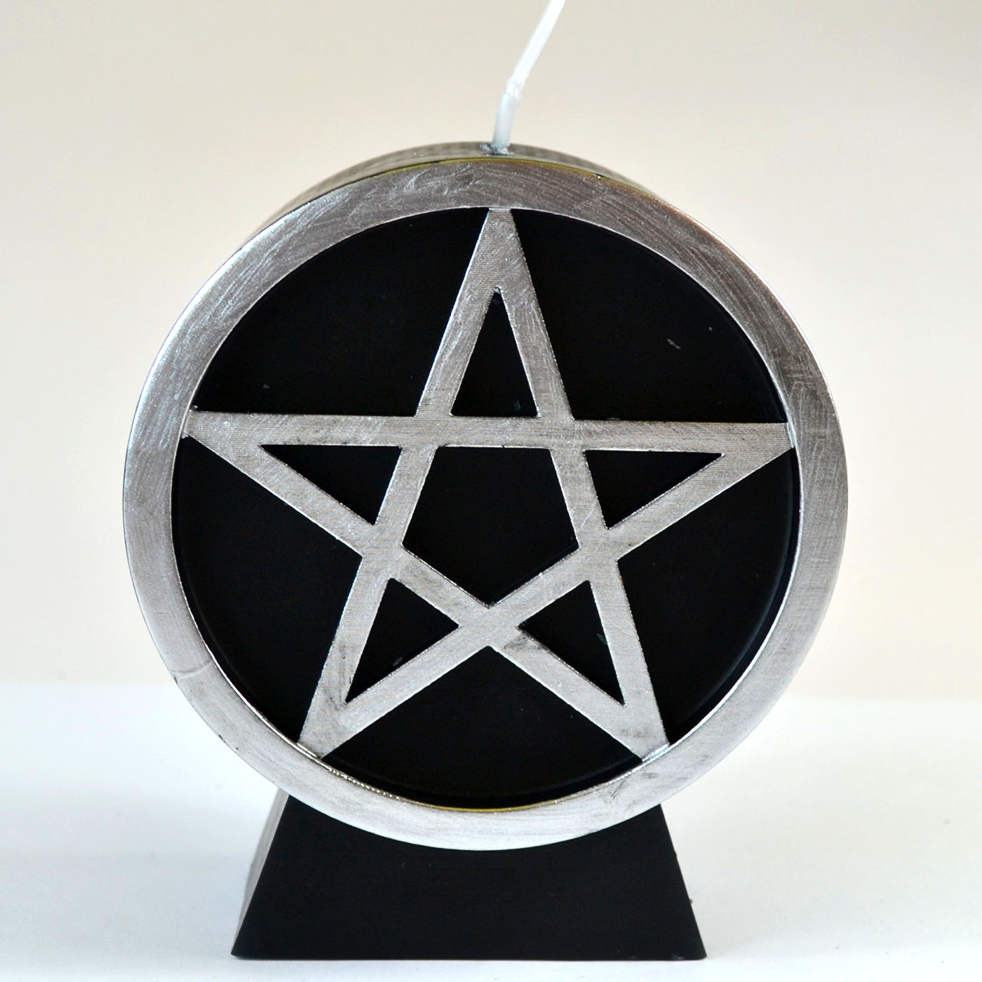 Cast in the shape of a classic pentacle with a base, this candle is black with a silver pentacle. Burn time ranges from 8-25 hours. 3.5"L X 2"W X 4.75"H