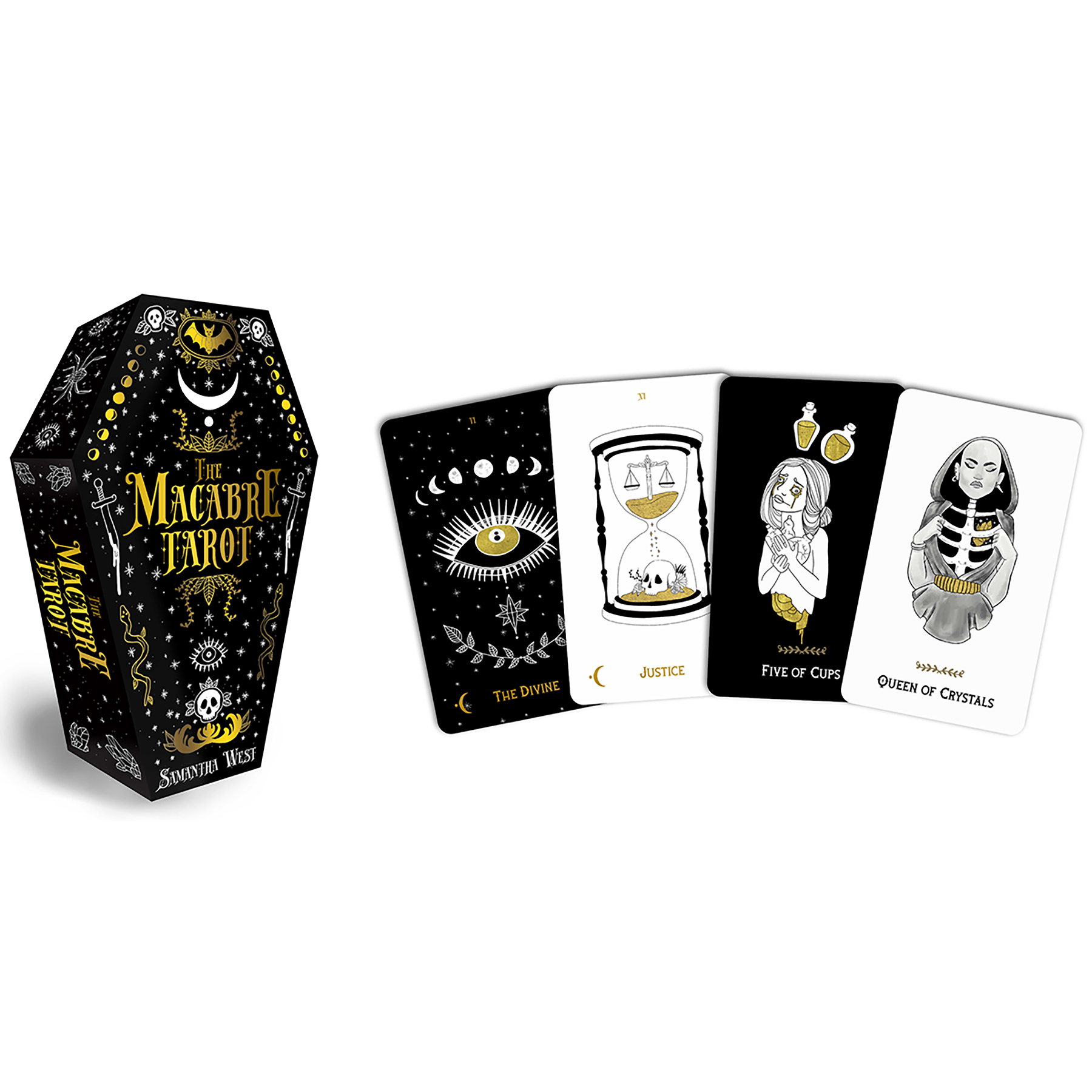 You will be pushed down the rabbit hole of your own psyche and forced to face your darkest thoughts. Are you ready to let your skin crawl? Are you ready to get lost in the night? Are you ready to embrace everything that lives in the shadows? Step into the darkness and release our fears. A 78-card tarot deck that calls you to turn away from the light and explore your own shadow; includes a 22-card major arcana and 4 minor arcana suits. Also included is a detailed guidebook. While following the traditional tarot structure, the deck takes a look at the darker sides of the cards and implores you to embrace all the spooky things that lurk in the dark. You will be pushed down the rabbit hole of your own psyche and forced to face your darkest thoughts.Be warned: this deck is not for the light-hearted or weak spirited. Tarot box in the shape of a Coffin box, magnetic box with a coffin opening sound; gilded edges and 3 colour palette of black, white and gold