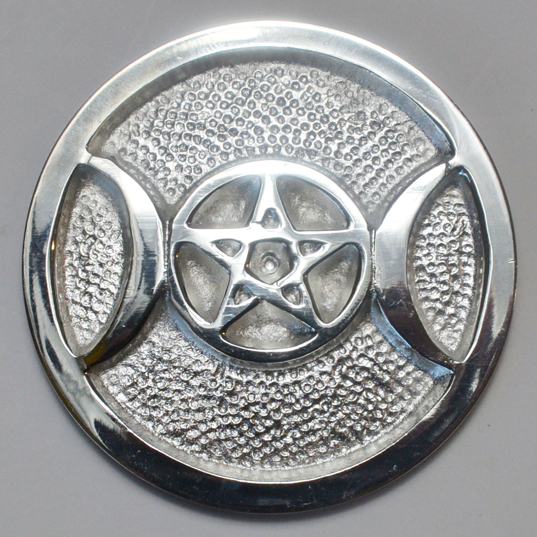This altar tile is an elegant addition to any altar or sacred space. Made of silver plated brass, it beautifully displays the sacred triple moon symbol.